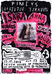 Iskra sitten viimeisenä. Eipä mulla ollut tietoa tästä bändistä etukäteen (jaksa mistään netistä kuunnella), joten kiinnosti kovasti. Tummasävyistä crustia tuli. Ja tulikin pitkästi, hitto nää soitti pitkän setin. Vai tuntuiko se vaan siltä, voi olla.